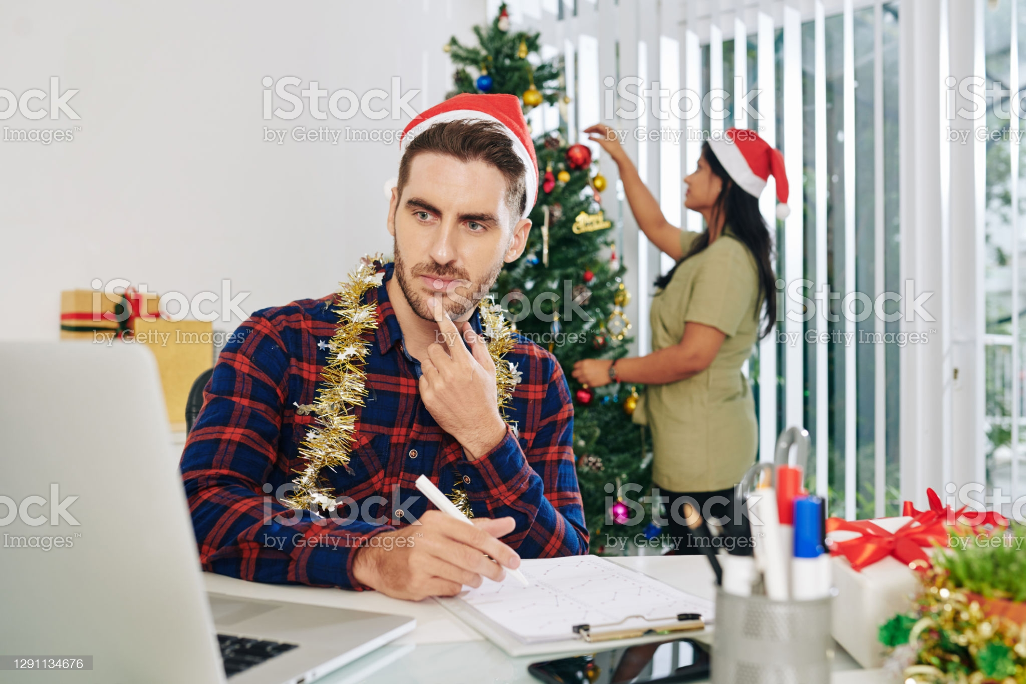 “Pensive man runs over financials while festive wife decorates tree in silence.”